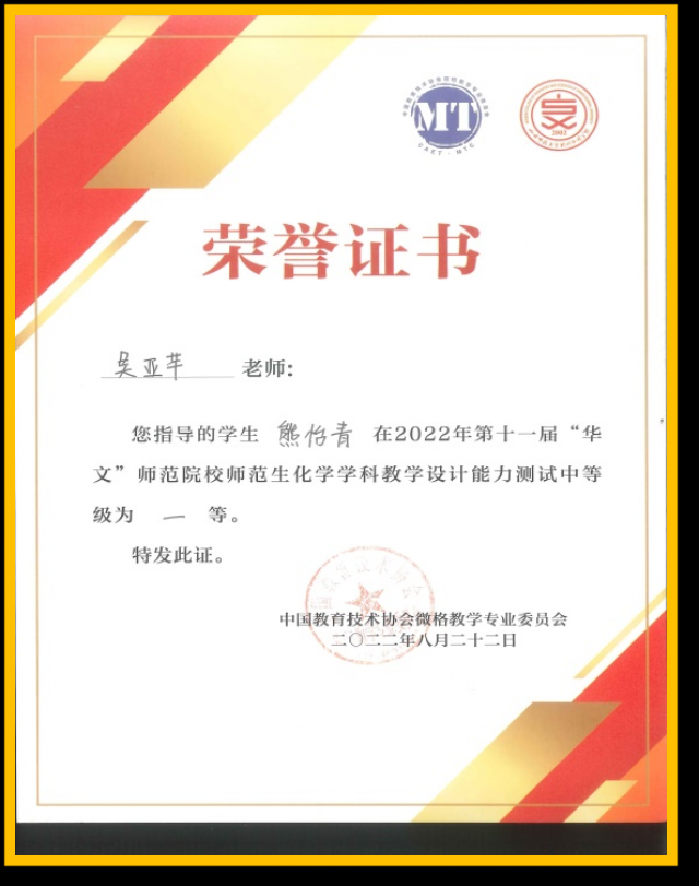 1. 2022年指导学生参加第十一届“华文杯”全国师范生化学教育教学设计能力测试“一等奖”;