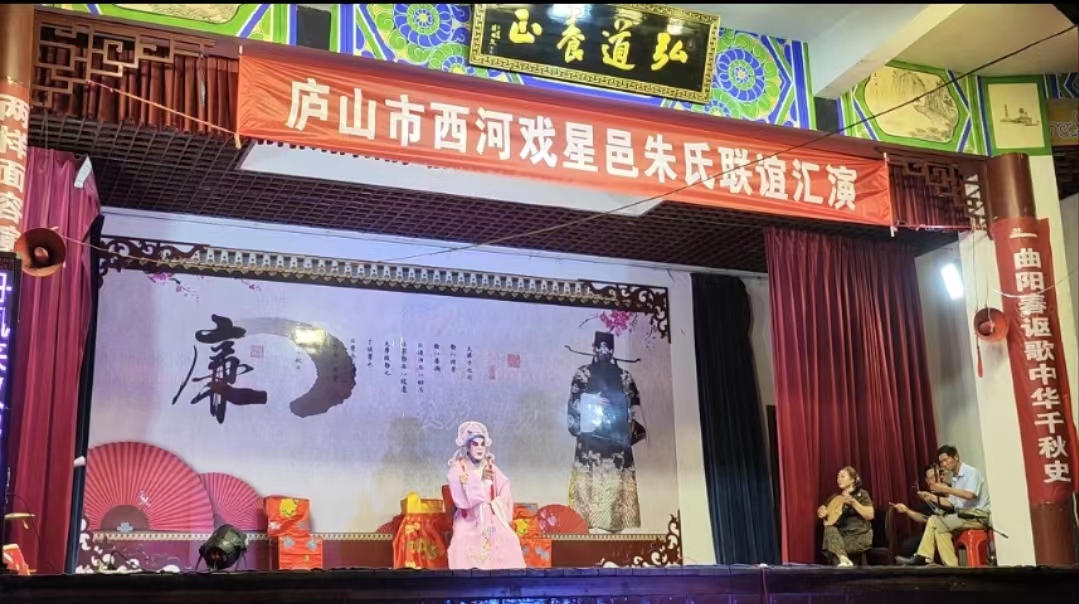 7月6日清晨,实践队员们就听见戏班子排戏的声音,那一声声戏腔,深深的吸引着队员们,大家走上前同演员们交流,希望深入了解这一中华优秀传统文化。传统地方戏是流传于民间的瑰宝,九江历史文脉绵长拥有全省数量最多的濒危剧种,西河戏便是硕果仅存的几大古老剧种之一,西河戏又称“弹腔戏”,俗名“星子大戏”,因为有西河水流经星子县故定名为西河戏。队员们通过与庐山市星邑朱氏西河戏戏班班主的交谈,了解到西河戏表演的内容主要是历朝历代的经典故事等,当天表演的内容是唐朝的安史之乱。傍晚,华灯初上,由庐山市星邑朱氏西河戏戏班子带来了西河戏盛宴,演员们唱腔雄厚有力,荡人心魄,令人无比陶醉,当地居民搬着小凳子,坐在新时代文明实践广场上,沉醉其中。