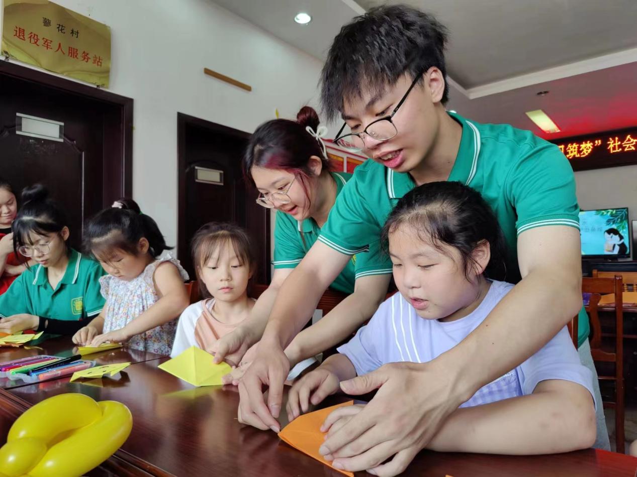 在安全教育环节,队员们主要针对防溺水进行了着重宣讲,让孩子们懂得珍爱生命,同时也学习了一些紧急自救知识。为加强新时代美育工作,队员们带领孩子们以“我心中的家乡”为主题进行绘画,孩子们兴高采烈,用彩笔和彩纸描绘着美丽的家乡,为了让美景立体起来,队员们带领孩子们用纸折出了蝴蝶、螃蟹、青蛙、小船等画中的场景,接下龙,大家一起用取自鄱阳湖的沙、石、贝壳等材料搭建一个梦想中的家园。最后,队员们教小朋友们朗诵和唱歌,“家是最小国,国是千万家”孩子们稚嫩的歌声中,我们在“童心港湾”开展的系列活动也落下帷幕。