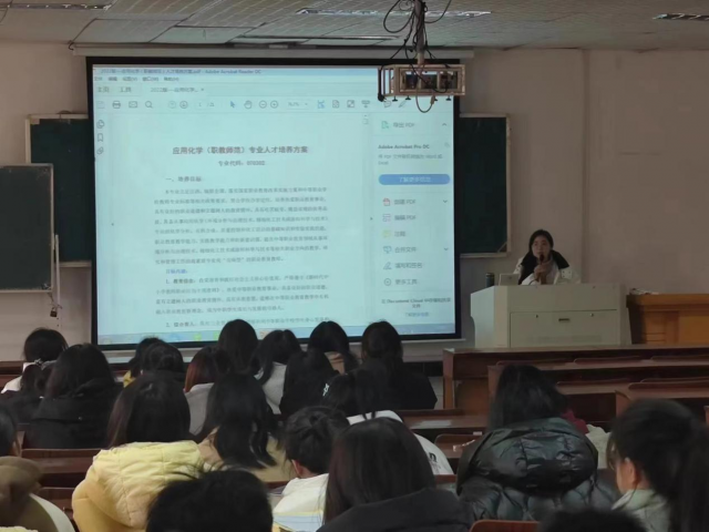 本次会议主要包含两方面内容:一是详细介绍应用化学专业两个方向(职教师范方向和应用方向)的人才培养方案架构、培养目标、毕业要求以及课程体系的差异性,解读分流培养中职学校的“双师型”教师以及应用型工程师的培养目标和课程体系,特别结合学校职教师资培养的特色,向同学们介绍学校职教师资培养的优势;二是根据学校专业方向分流要求,强调了应用化学专业方向分流工作的意义和必要性,鼓励同学们在充分理解应用化学人才培养方案的基础上,找准职业方向,制定职业规划,确定自己努力的方向。