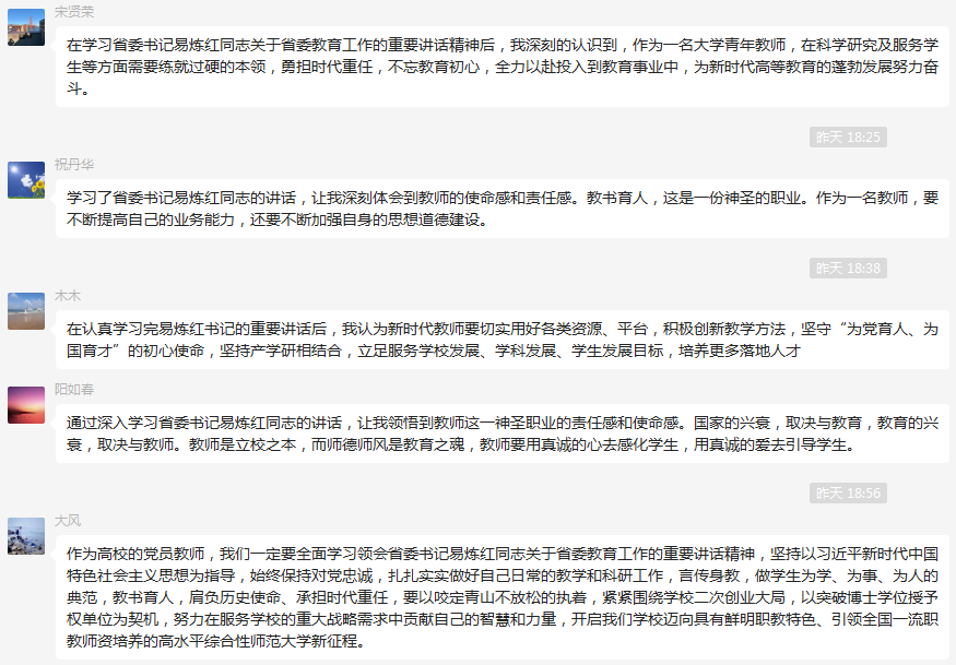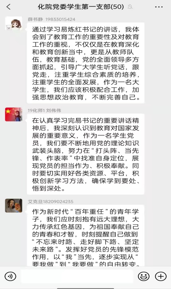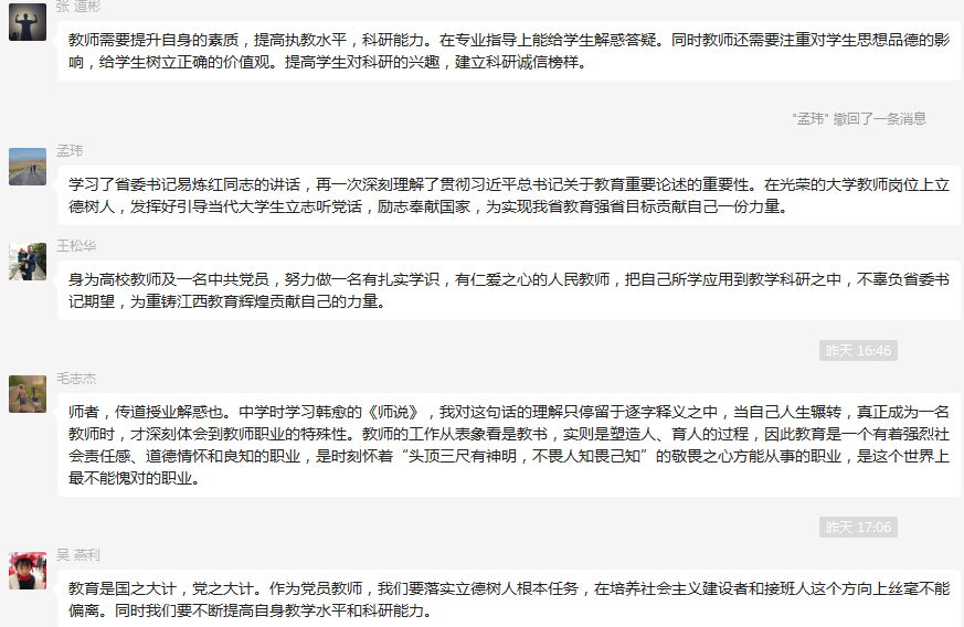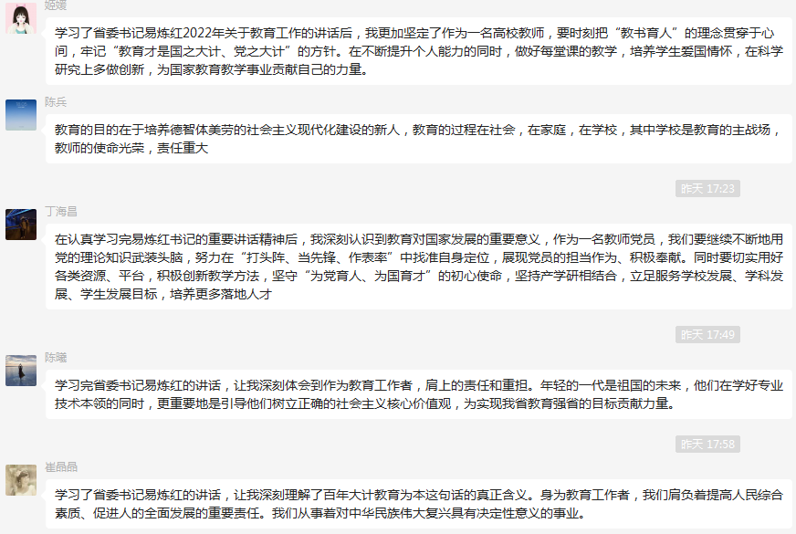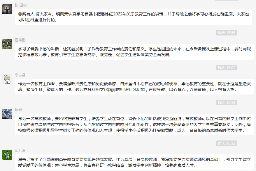 在线上讨论会上党员教师高飞说,通过学习易书记的讲话,我深刻认识到作为一名高校教师,应该铸魂育人,提高自身的教学科研水平,增强服务意识,以身作则,引导广大学生树立正确的人生观价值观。党员教师李卉说:“通过学习易书记2022年关于教育工作的讲话,我认识到作为高校教师,我们要切实把思想和行动统一到易炼红书记的重要讲话精神上来,在教学科研、服务学生等方面练就过硬本领,勇担时代重任。我们要全面落实立德树人根本任务,把习近平新时代中国特色社会主义思想融入教材、课堂、头脑。更要始终牢记习近平总书记对教师的殷切重托,进一步强化铸魂育人使命,引导广大青年学生努力成为堪当时代重任的接班人。”学生党员刘伟伟说:“在认真学习完易书记的重要讲话后,我深刻认识到教育对国家发展的重要意义,作为一名学生党员,我们要不断地用党的理论知识武装头脑,努力在“打头阵、当先锋、作表率”中找准自身定位,展现党员的担当作为、积极奉献。同时要切实用好各类资源、平台,积极创新学习方法,确保学到要处、悟到深处。”