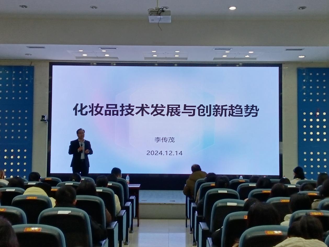 李传茂总经理从“化妆品技术发展”“化妆品创新趋势”“丹姿科研成果”“化妆品行业发展前景”等方面展开讲述。他指出,优秀的化妆品研发工程师不仅需要扎实的化学专业知识,还要及时关注市场动态、了解消费者需求;要不断创新,研发出符合市场需求的新产品。他鼓励同学们要树立坚定的专业信心,充分利用校内外的各类教学和实践资源,不断提升专业素养和实践能力。在交流环节,同学们踊跃发言,李传茂总经理耐心回答同学们的问题,并结合自身行业经历提出建议。