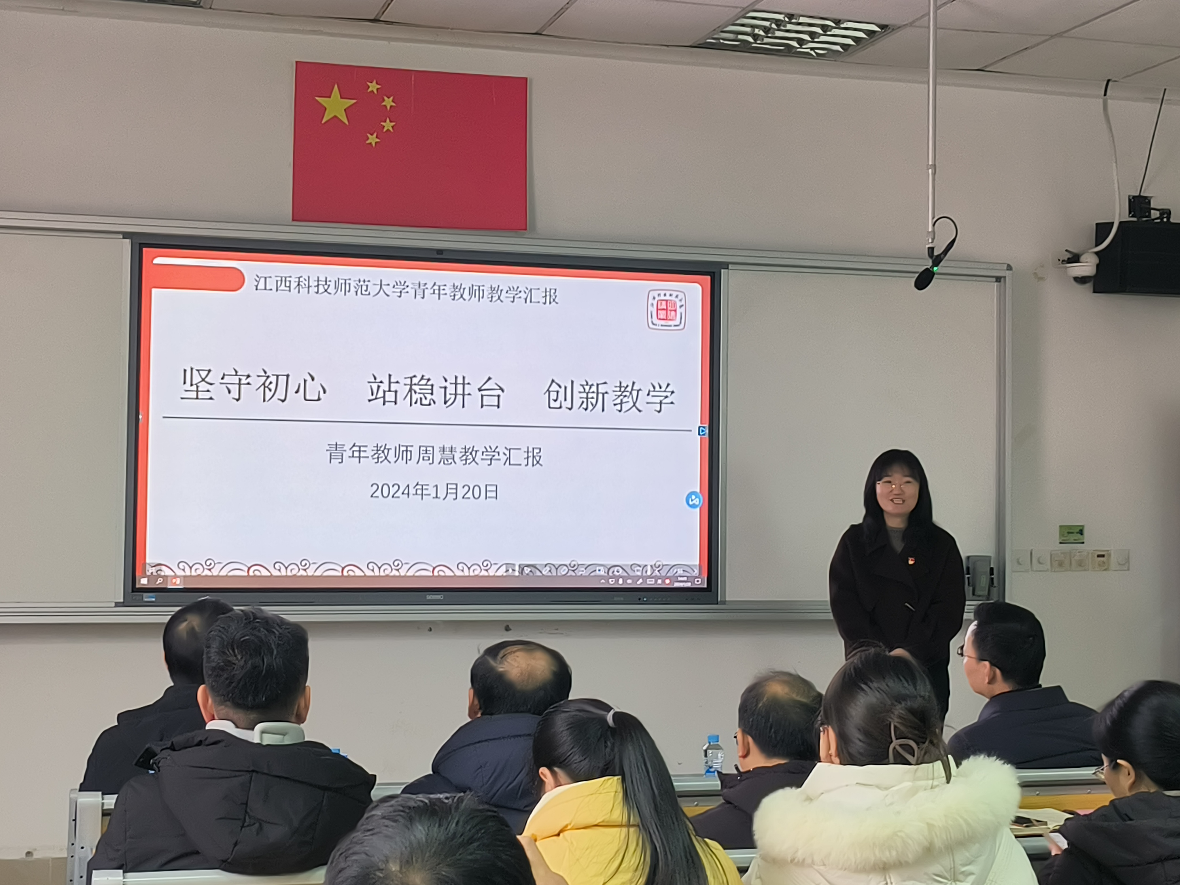 青年教师周慧博士作题为《坚守初心 站稳讲台 创新教学》的报告,周博士围绕因热爱而执着、如何做好教学、如何实现突破等方面进行阐释,强调课堂教学要以学生为中心,教学设计要以问题为导向,并结合自身经历就教学改革提出诸多建议。