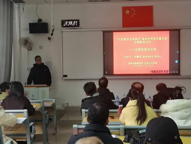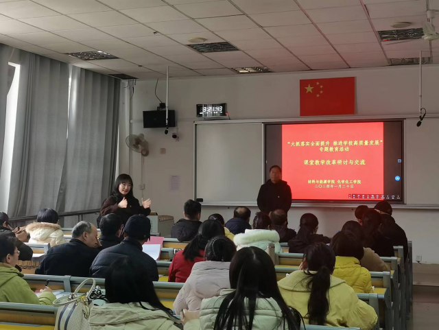 学院联合材料与能源学院开展课堂教学改革研讨活动,校党委委员、副校长郑鹏武莅临现场指导专题教育工作。郑鹏武指出全体教师要提高政治站位,不断提高履职尽责的能力和水平,切实把专题教育成果转化为学校高质量发展的实际成效;要紧跟时代发展新形势,聚焦课程建设,深化课堂教学改革,提高人才培养质量;要紧扣教育强国战略需求,树立以学生为中心的教学理念,积极投身课堂教学改革。