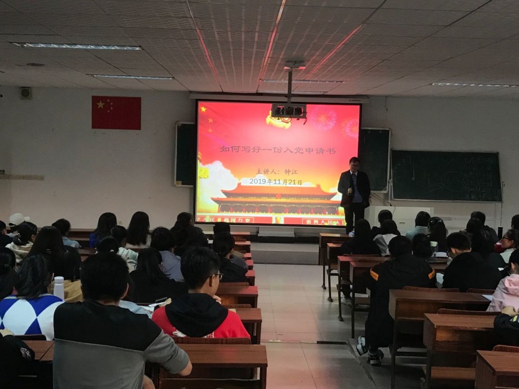 11月21日在9311教室,我院学生党支部支委钟江老师围绕递交入党申请书的意义的主题展开讲解,学习期间,钟江老师根据同学实际,现场回答了同学们提出的如何才能加入中国共产党等多个问题,互动交流频繁,同学们表示收获很大。