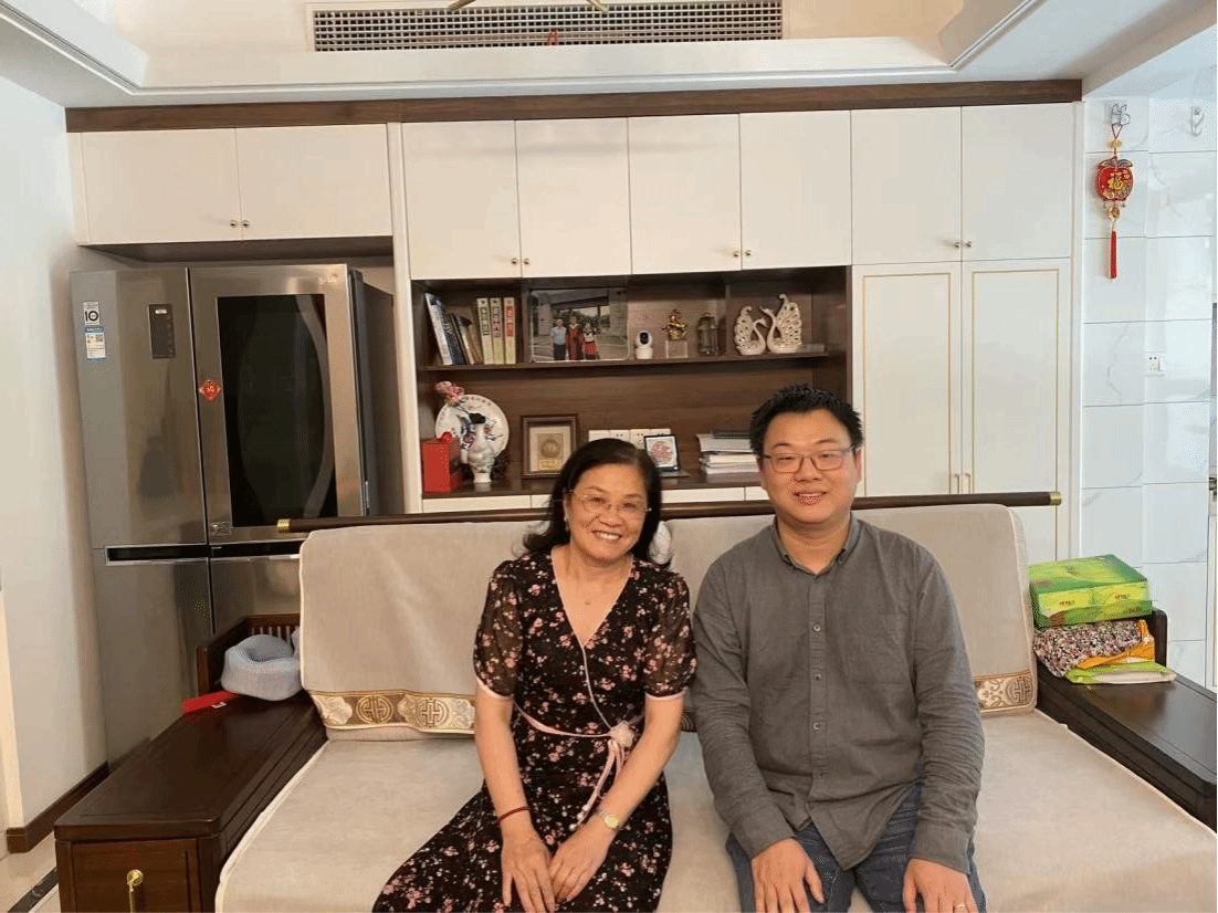 WilliamHill威廉希尔官网副院长吴亚芊和分工会许乐群老师在退休教师程玉峰家与程老师进行亲切交谈。
