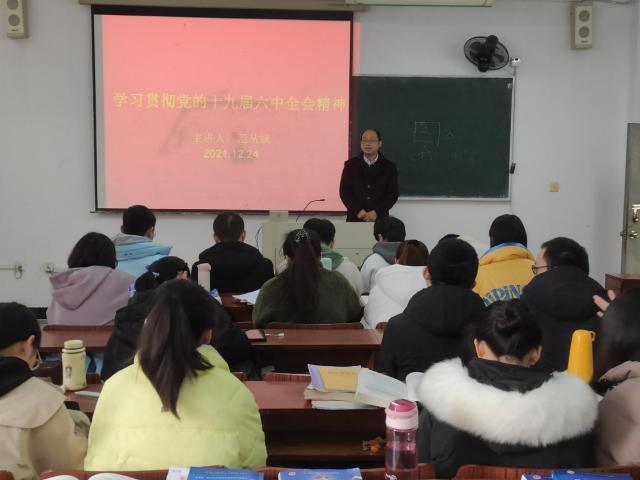 为学习深入学习贯彻党的十九届六中全会精神,引导我院大学生坚定理想信念,筑牢信仰之基,2021年12月24日,范丛斌副院长在9号教学楼9501教室为我院青年学生进行了十九届六中全会精神宣讲。