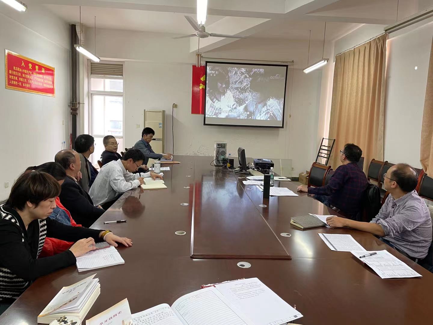 会上,大家共同学习了《中华人民共和国简史》、《改革开放史》和《社会主义发展简史》以及新修订的《中国共产党普通高等学校基层组织工作条例》。围绕伟大建党精神的深刻内涵和时代价值、以史为鉴开、创未来的根本要求和习近平总书记代表党中央发出的伟大号召三个专题开展理论学习和研讨交流。随后,大家一同观看了电视专题片《同心共筑中国梦》第二集:共同繁荣。