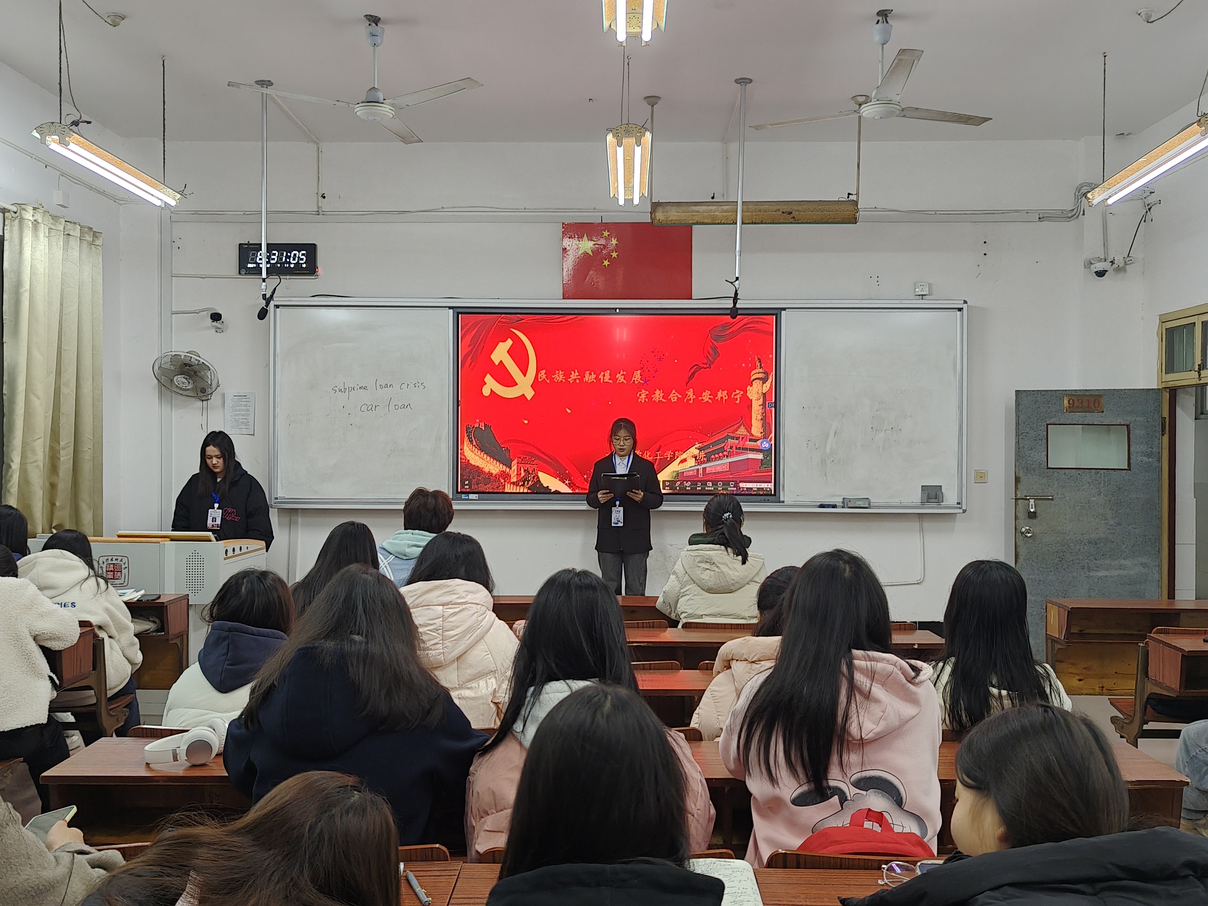 为了增强学生对民族团结的认识,铸牢中华民族共同体意识,引导学生正确理解党的宗教方针政策,12月12日,WilliamHill威廉希尔官网“红五星”宣讲团深入24应用化学(三校生)1班,于9310开展“民族共融促发展,宗教和顺安邦宁”主题宣讲活动。