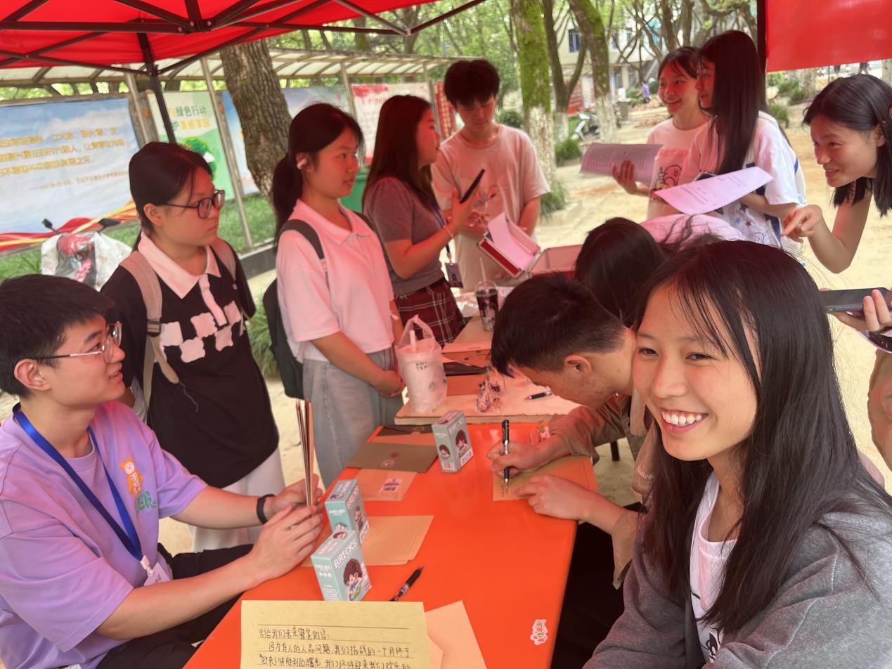 本次游园会设置了“歌名猜猜猜”和“心理知识问答”两个互动小游戏,旨在让同学们在欢快轻松的游戏中舒缓心理压力,学习心理健康知识,引导同学们关注自身心理健康,培养积极向上的心态。游戏期间,同学们满怀热情、积极尝试,活动现场充满着学生的欢声笑语,气氛欢快热闹。同时,游园会还设置了“给未来寝室的我们写一封信”活动,同学们积极参加,大家以笔为针,以纸为线,将对室友的种种情感织入信中,一封封信件的背后展现出的是一个个让人温暖的瞬间。