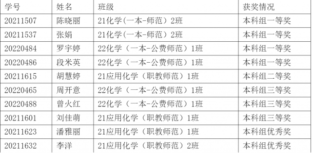 我院高度重视本次大赛,经过精心筹备与初赛、复赛的严格筛选,最终选派了两支参赛队伍,分别由6名化学师范生和4名应用化学职教师范生组成,代表我院参赛。在指导教师的专业指导下,参赛选手们经过多次深入的课程准备与细致演练,历经片段教学设计、教学设计思路阐述、模拟授课及现场答辩等多个环节的激烈竞争,最终取得了优异成绩。化学师范生队伍中,陈晓丽、张娟、罗宇婷、段米英4位同学荣获本科组一等奖,周开意、曾火红2位同学荣获本科组三等奖;应用化学职教师范生队伍中,胡慧婷同学荣获本科组二等奖,刘佳萌同学荣获本科生组三等奖,李洋、潘雅丽2位同学荣获本科生组优秀奖。具体获奖名单详见下表: