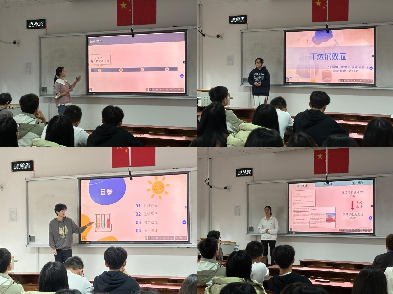 为提升学生的教学技能和专业素养,WilliamHill威廉希尔官网于10月22日下午在9113教室开展“华文杯”教学展示活动。此次活动邀请了我院在全国“华文杯”竞赛中获奖的周开意、罗宇婷、段米英、曾火红、胡慧婷五位同学为大家进行教学展示并进行经验交流,分享比赛心得。全体23级应用化学(含职教师范)和化学(一本-师范)专业学生参加此次会议,会议由学院教学办主任周志老师主持。