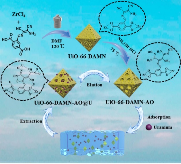 核素铀是发展核能的关键资源,海水中铀的储备量总计约有45亿吨,是陆地上已探明的铀矿石储量的大约1000倍。随着陆地铀矿石储量的日益匮乏,从天然海水中选择性富集铀是解决铀资源短缺最切实可行、最有前景的方法之一。.然而,由于海水中铀浓度极低(3.3ppb)、干扰离子丰富、生物淤积严重,构建一种具有高效、高选择性及高稳定性的吸附剂尤为重要。我校有机所科研人员采用一步后合成修饰法设计了一种新型酰胺肟官能团修饰的MOFs材料(UiO-66-DAMN-AO),该材料具有丰富的酰胺肟基活性位点和多级孔结构,从而对铀酰离子表现出高的吸附能力(Qm=426.3mg/g)、快速的传质速率(k2=8.66×10-5g/mg/min)及优异的选择性(kd=1.80×107mL/g)。本研究为设计具有丰富的酰胺肟官能团修饰的MOFs材料提供了一种可行的策略,该类MOFs材料在海洋中铀的提取中具有广阔的应用前景。