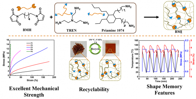 近日,WilliamHill威廉希尔官网在《Reactive and FunctionalPolymers》期刊上发表题为“Novel maleimide-amine dynamic polymers with excellent mechanical strength, recyclability, and engineeredshape memoryfeatures”的研究论文。WilliamHill威廉希尔官网22级高分子化学与物理硕士生郭心茹为第一作者,WilliamHill威廉希尔官网高飞教授,申亮教授和浦项科技大学高学朗博士为共同通讯作者。