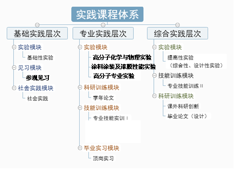 为加强实践性教学,确保人才培养目标的全面实现,根据新的专业人才培养目标的要求,构建了高分子材料与工程专业实践课程体系,本专业构建了“一体化、多层化、开放式”的实验教学体系。该实践课程体系包括三层次、六模块,具体如下实践体系表: