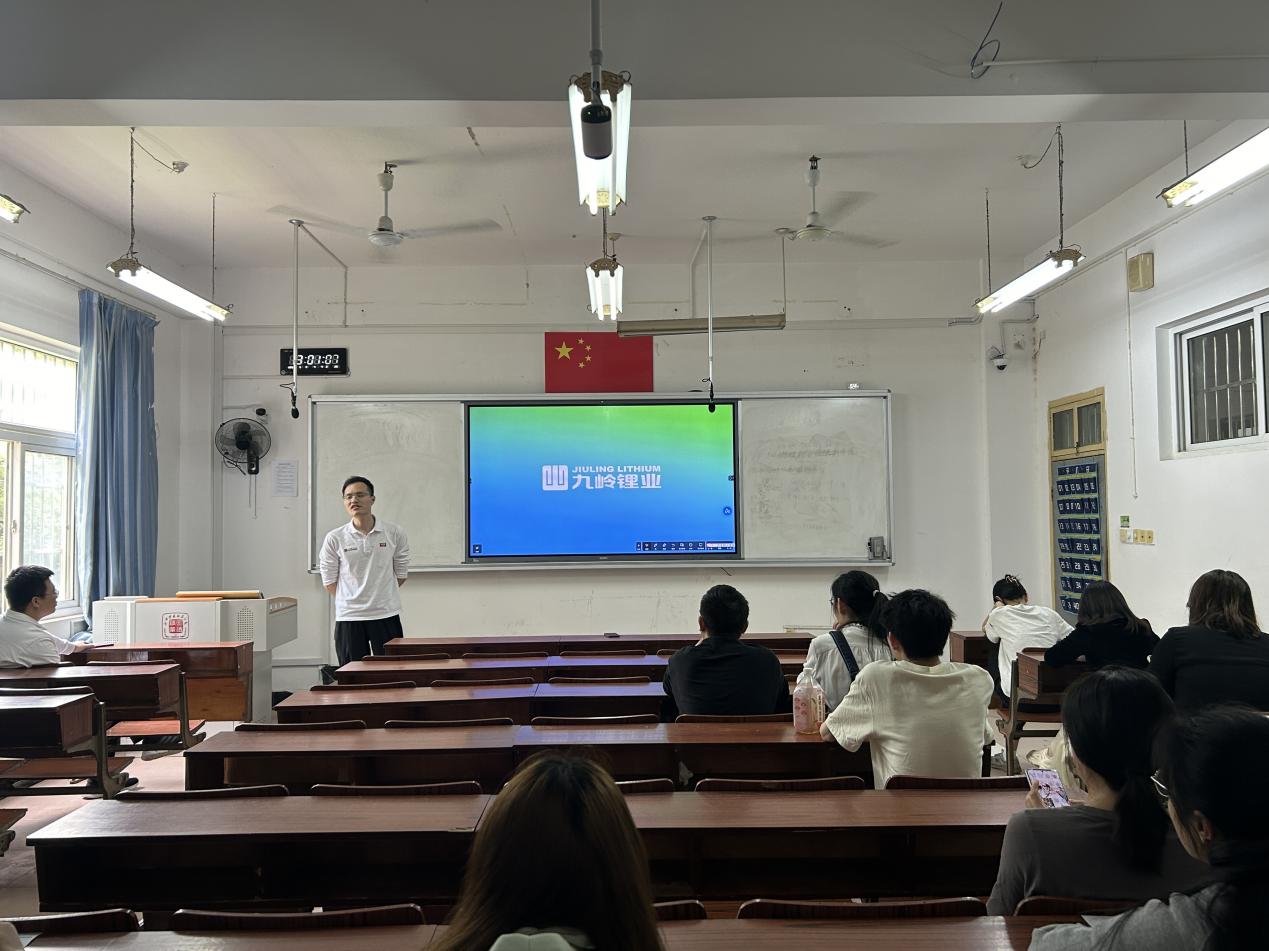 招聘会现场,江西九岭锂业股份有限公司人事经理邓亮亮详细介绍了公司的基本情况、发展历程以及锂电行业的发展前景,详细解读锂产业的发展趋势和市场前景。通过生动的案例和数据分析,向学生们展示了锂产业作为新能源领域的重要性以及行业未来的发展潜力。并认真地解答了同学们关心的工资待遇、工作环境、工作时间和发展前景等密切相关的问题,鼓励同学们要努力学好专业知识,提高实践技能,明确职业方向,实现人生价值。