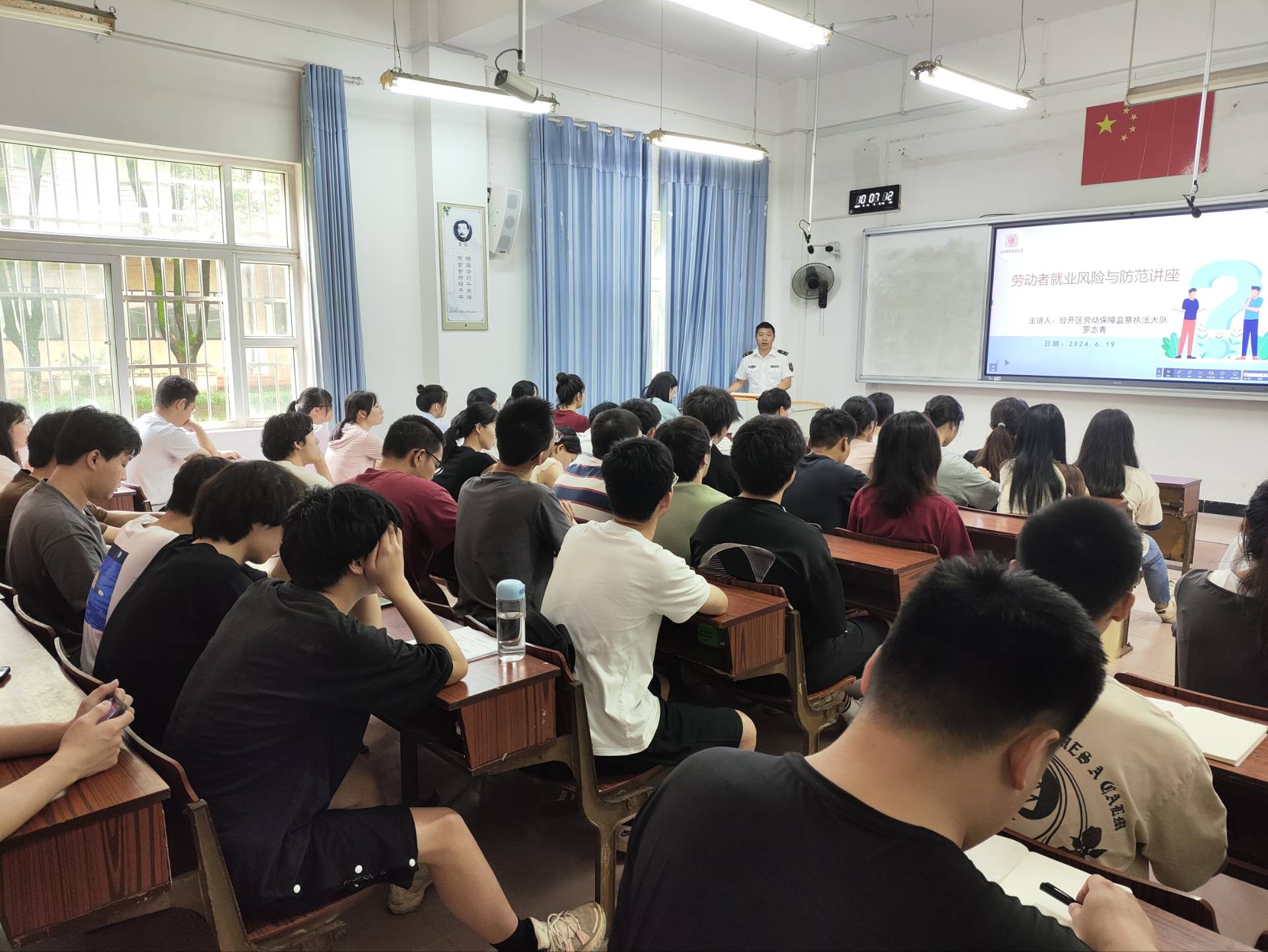 讲座中,罗志青用真实的典型案例向同学们做了详细的剖析,并着重讲解了七大要点:一是解释了什么是劳动监察,让同学们了解了劳动监察的职责与作用;二是提醒同学们在找工作时核实工作单位信息,避免上当受骗;三是强调了签订劳务合同的注意事项;四是让同学们在入职时熟悉公司的规章制度;五是鼓励同学们当权益受到侵害时及时向劳动部门反映;六是提醒同学们不能将身份证借给用人单位,以防个人信息被滥用;七是让同学们明确自己的工作性质和职责,防止被诱导从事非法或与合同约定不符的工作。罗志青的授课深入浅出、内容丰富,赢得了现场师生的热烈掌声。