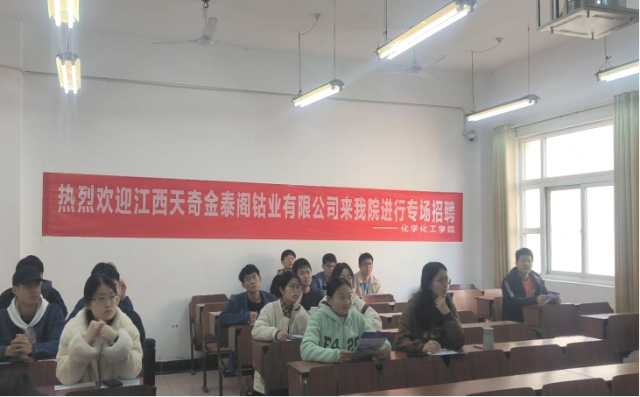 3月2日下午3点整,专场招聘会正式开始,负责人王进通过PPT向参会同学详细介绍了江西天奇金泰阁钴业有限公司的业务构成、工作范围、发展方向、科创技术以及员工福利等方面内容,激发了参会同学浓厚的就业兴趣。介绍完公司概况后,负责人王进亲切地与参会同学交谈、答疑解惑,交流就业的方方面面。参会学生也展示出了当代大学生应有的就业热情,详细询问了工作单位的具体事务、衣食住行等各方面的工作保障及相关福利待遇政策。