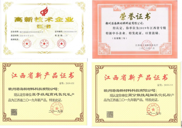 湛海科技高度重视自主创新能力提升,灵活运用协同创新模式,与高校、科研院所建立了稳定的产学研合作,承担了多项省、市科技重大项目。拥有多项自主知识产权,为全国稀土技术标准成员单位、“国家技术标准创新基地(稀土)”第一届理事单位、 “国家新材料测试评价平台稀土行业中心”第一届理事单位。负责主导起草《超细粉体氧化钆》、《超细粉体氧化镝》、《氟化钇》等多项国家&稀土行业标准;2019年湛海科技被纳入“专精特新” 发展企业目录。开发的“原子能高纯氧化钆”和“高分散性超细氧化钇”产品获得2019年江西省新产品认证,目前湛海科技高纯稀土氧化物、化合物及其纳米产品已经成为行业发展标杆。