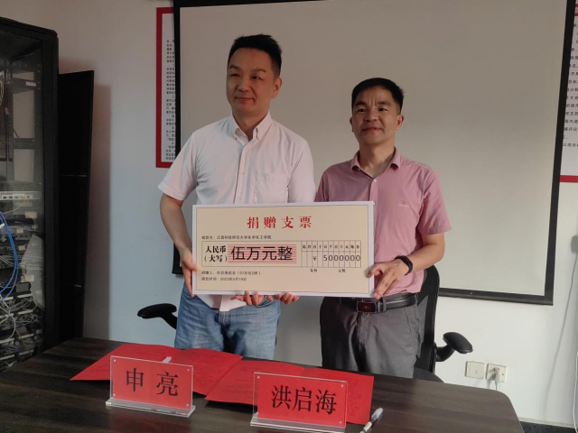 院长申亮代表学院与资助校友签订捐赠协议,交接捐赠票据。相信“启海益坚”奖助学金定将在学院人才培养和奖助育人中发挥积极作用。