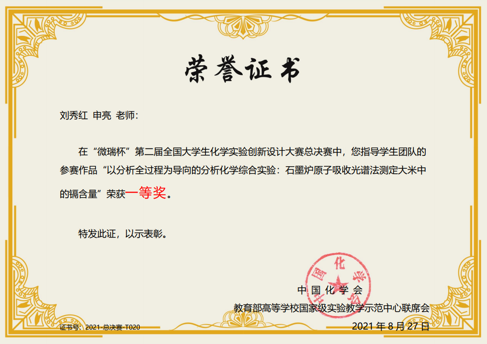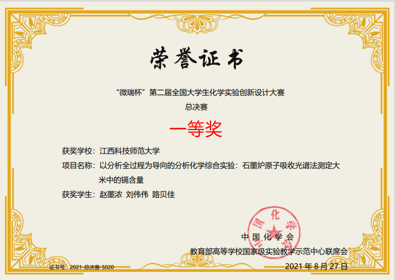 ​8月27日,由中国化学会和教育部高等学校国家级实验教学示范中心联席会主办的2021年“微瑞杯”第二届全国大学生化学实验创新设计竞赛全国总决赛在云端落下帷幕,由赵墨浓、刘伟伟、路贝佳同学组成的参赛团队荣获全国总决赛一等奖,指导老师为刘秀红、申亮。