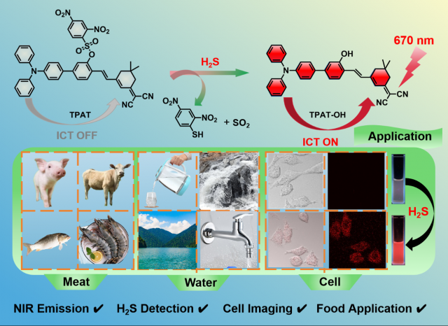 硫化氢(H2S)与食品安全和生物系统密切相关,H2S不仅是食品腐败的重要标志物,同时作为第三种内源性气体信号分子,在生物体心血管保护、炎症调控等生理过程中发挥着关键作用,其水平异常与糖尿病、帕金森病等疾病密切相关。因此,H2S实时监测对于保护人类食品及生命安全至关重要。H2S传统检测方法依赖复杂仪器且无法实时成像,而现有荧光探针普遍存在发射波长短(<650nm )、抗干扰能力弱等问题,限制了实际应用。