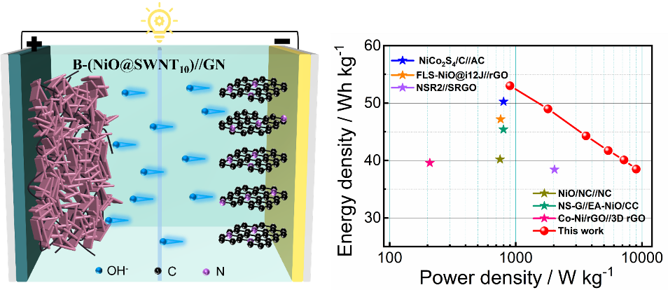软包超级电容器 具有高功率密度、高安全性和长寿命等显著优势,然而其能量密度较低且循环稳定性不足等问题在一定程度上限制了其实际应用。本研究中,我们通过简单的原位成核组装和高温煅烧策略,制备了硼改性的单壁碳纳米管增强氧化镍(B-(NiO@SWNT10))电极,实现了NiO基超级电容器的高能量密度和长期循环稳定性。该电极具有丰富的氧空位和高比表面积,研究结果表明,B-(NiO@SWNT10)电极在1 A g-1的电流密度下展现出高达1257.7 F g-1的比电容,且具有出色的循环稳定性(10000次循环后电容保持率为98.3%)。此外,B-(NiO@SWNT10)//氮掺杂石墨烯(GN)器件具有卓越的能量密度(在功率密度为900 W kg-1时,能量密度为53.0 Wh kg-1),超过了目前报道的诸多超级电容器性能。组装的软包超级电容器展现出强劲的电化学性能,能够有效地为智能手机和智能手环等可穿戴电子设备供电。这项工作为软包超级电容器在便携式电子产品中的实际应用提供了新的思路。