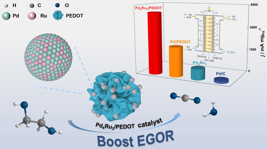 在本研究工作中,舒金兵博士课题组通过一种低成本的常温一锅法反应成功制备出比表面积大、孔隙率高、分散性好的高催化活性的聚(3,4-乙撑二氧噻吩)(PEDOT)颗粒负载的钌掺杂钯基三元纳米复合催化剂(PdRu/PEDOT)。PEDOT提供了足够的吸附位点来支持PdRu双金属形成无定形多孔结构,这为电极和电解质之间的电荷和电子转移提供了额外的反应位点,并加速了乙二醇氧化反应(EGOR)。优化的Pd4Ru2/PEDOT对碱性体系中EGOR表现出优异的电催化性能,质量活性达到4141.8 mA mgPd-1,是商业Pt/C催化剂的数倍。长期循环伏安法(CV)和计时安培法(CA)测试结果表明,PEDOT的富电子共轭结构与Pd和Ru之间的协同作用赋予Pd4Ru2/PEDOT更为优异的催化耐久性和抗中毒能力。该研究为DEGFCs阳极催化剂的开发提供了坚实的理论基础和新的策略。