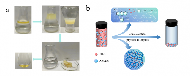 图一 (a)超分子凝胶剂应用于溢油回收示意图(b)干凝胶吸附罗丹明B染料机理示意图