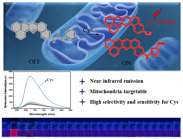研究团队以苯并吡喃盐为荧光骨架,引入苯基硫代甲酸酯作为Cys识别位点,设计出具有线粒体靶向功能的荧光探针BP-PTC。该探针在570 nm激发光下,通过Cys与硫代碳酸苯酯的特异性“亲核加成-环化-消除”反应,释放出670 nm的近红外荧光信号,该近红外波段的发射光能够有效穿透生物组织并降低背景干扰。实验表明,BP-PTC检测灵敏度高,在0-28 μM范围内与Cys浓度呈良好线性关系,且对其他氨基酸及常见离子表现出优异选择性,可实现“肉眼可视化”检测。