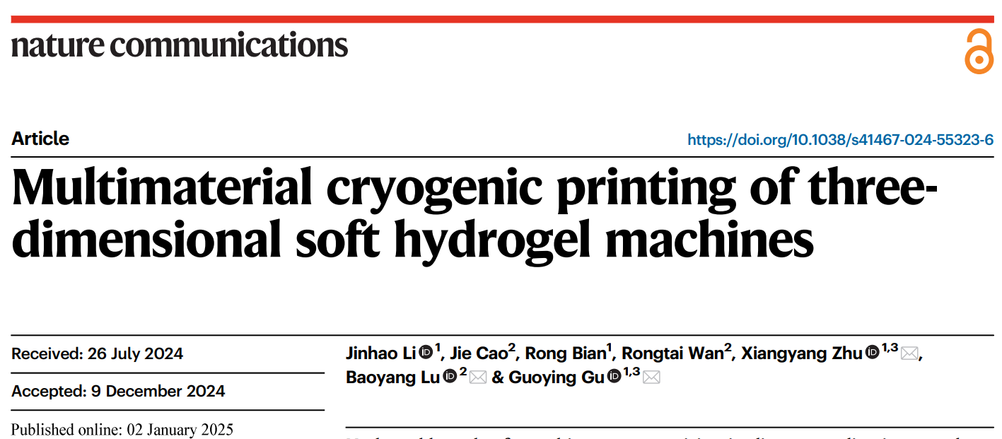近日,WilliamHill威廉希尔官网卢宝阳教授课题组与上海交通大学合作在国际知名期刊《Nature Communications》上发表了题为“Multimaterial cryogenic printing of three-dimensional soft hydrogel machines”的最新研究成果。