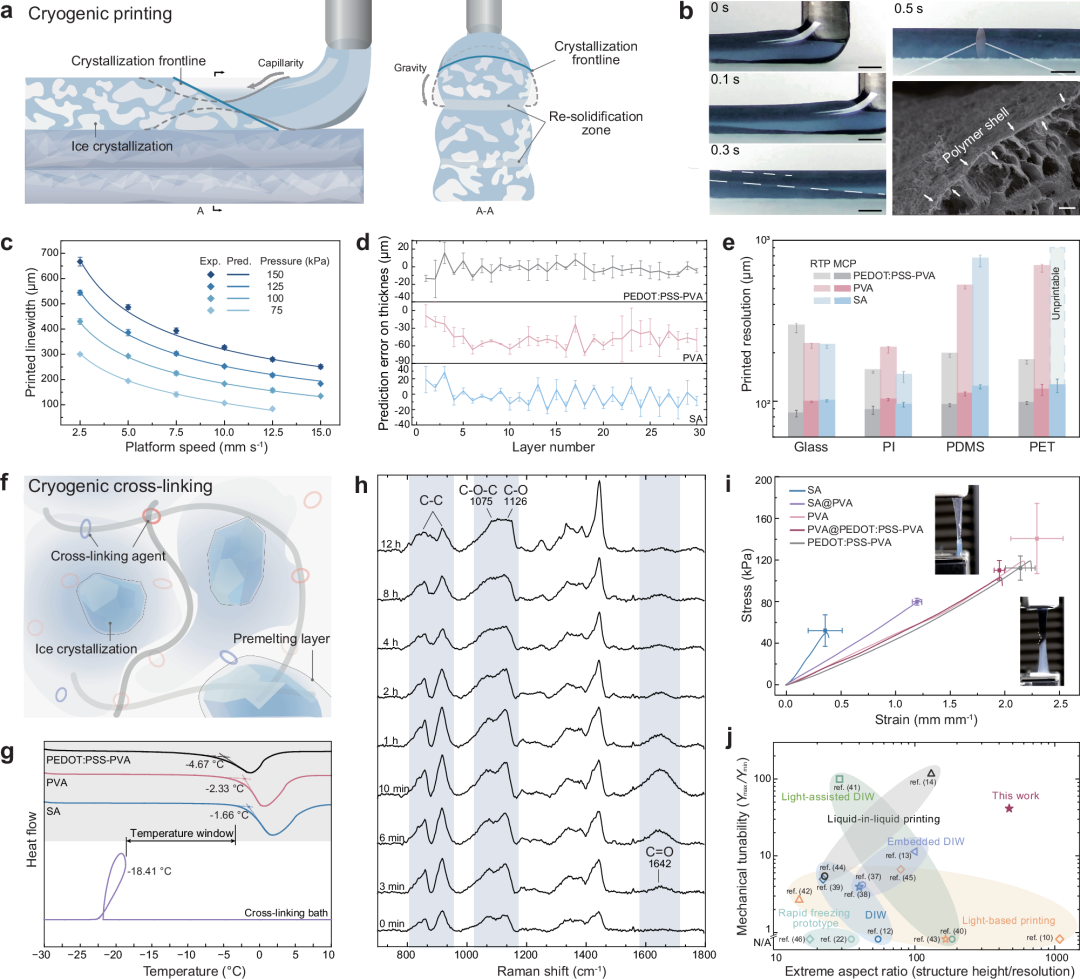 受水凝胶体系中的丰富水含量启发,我们提出了一种多材料低温3D打印技术(MCP),利用溶剂低温结晶临时支撑聚合物网络成型,建立了基于低温溶剂相变辅助的多材料三维结构水凝胶制造新范式。该技术策略对具有不同黏度、交联机理的广泛水凝胶墨水具有普适性,可以制造多种具有复杂结构的水凝胶与集成器件。所开发的全3D打印、全水凝胶软体器件进一步验证了其在软体机器人和生物电子领域的广阔应用前景,对水凝胶软体机器人研究具有重要的启发意义。