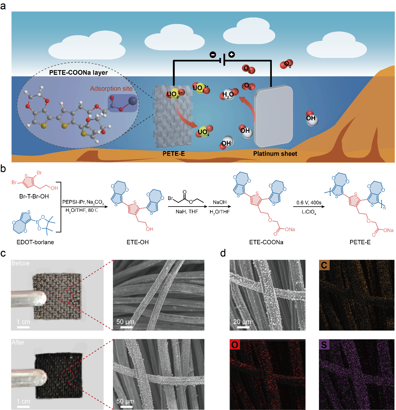 本研究通过将羧基功能化聚(3,4-乙烯二氧噻吩)(PEDOT)衍生物原位电合成于柔性碳布基底上,构建了一种新型自支撑电极,其具备简易制备工艺并提供丰富的选择性吸附位点。实验结果表明,在交变电场作用下,该电极展现出对铀的高选择性(分配系数Kd(U)≈2.05×10⁶ mL g-1)、十次循环后仍保持91%的优异去除效率、1670 mg g-1的高提取容量,以及在天然海水中0.42 mg g-1 d-1显著提取速率,性能优于多数前沿电极材料。进一步研究表明,电萃取机制涉及羧基基团对铀酰离子的捕获及其在Na⁺存在下转化为Na₂O(UO₃·H₂O)ₓ沉淀的过程。该电极有望在铀电萃取领域实现性能突破,并成为天然海水实际应用的有效工具。