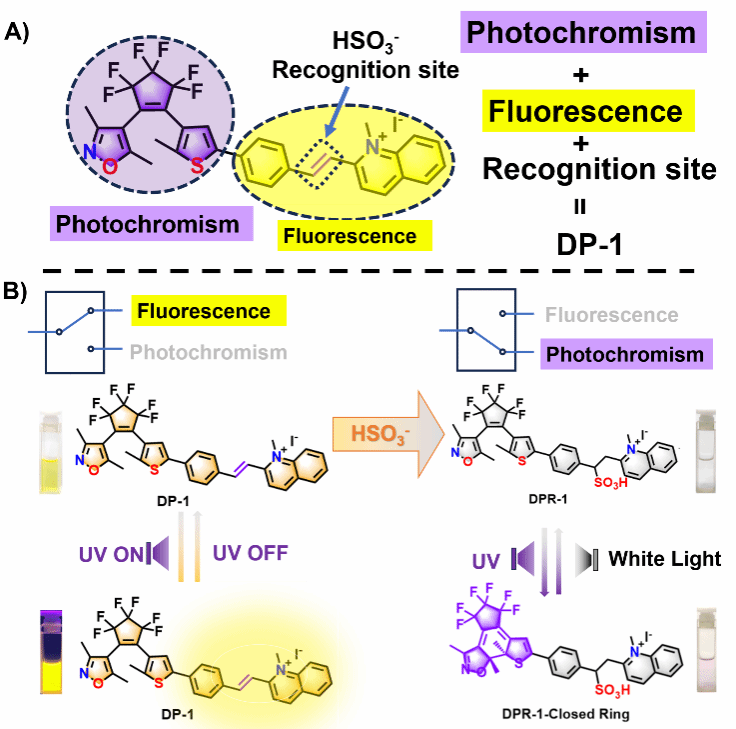 本研究创新性地设计并开发了一种基于二芳基乙烯骨架、整合荧光团与离子识别位点的双功能荧光探针DP-1。该探针在初始状态下呈现最大发射波长为600 nm的黄色荧光,当特异性识别HSO₃⁻后发生显著荧光猝灭效应。实验证实,DP-1对目标离子展现出优异的选择性与超低检测限(16 nM)。值得关注的是,与传统探针不同,DP-1在识别HSO₃⁻前具有稳定的荧光特性且未检测到光致变色现象;而离子识别后,其光致变色功能被激活,同时荧光完全消失,实现了由HSO₃⁻触发的"荧光-光致变色"双模态信号切换机制。通过核磁滴定、高分辨质谱及密度泛函理论计算,系统阐明了该识别过程的响应机理。此外,DP-1在活细胞与斑马鱼体内成像实验中均成功实现了HSO₃⁻的可视化检测。其优异的生物相容性与组织穿透能力为生物体内活性硫物种的动态监测提供了可靠工具。该研究为开发利用光致变色二芳烯衍生物构建智能探针开辟了新思路,在食品安全检测与疾病诊断领域展现出重要应用前景。
