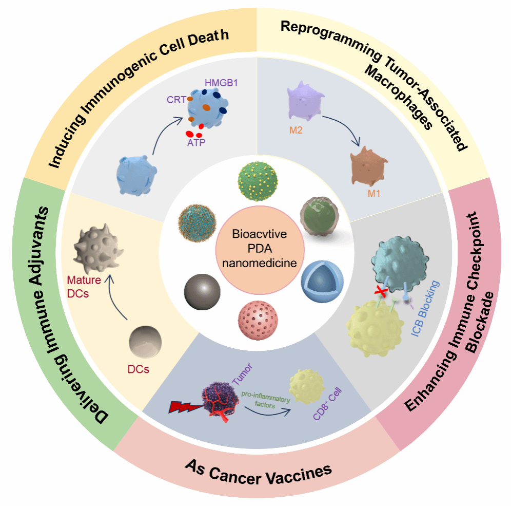 近年来,通过激活患者的免疫系统来对抗肿瘤癌症免疫疗法取得了一些重大进展。然而,肿瘤微环境的免疫抑制本性和全身给药相关的副作用限制了免疫治疗的疗效。利用生物活性聚多巴胺 (PDA) 材料独特的物理化学特性和生物相容性的特性,以及其在受控药物和免疫调节剂释放中的优势,最近的研究工作集中在构建具有免疫调节功能的工程化PDA 纳米药物上,但目前仍缺乏相关的系统性综述评价。本文总结了生物活性 PDA 纳米药物在癌症免疫治疗中的应用的最新进展,重点介绍了它们在诱导免疫原性细胞死亡、重编程肿瘤相关巨噬细胞、作为癌症疫苗和增强免疫检查点阻断等方面的作用。并进一步深入讨论了生物活性 PDA 纳米药物的挑战和未来前景,旨在促进跨学科交叉,并为 PDA 材料的进一步发展和临床转化提供灵感。