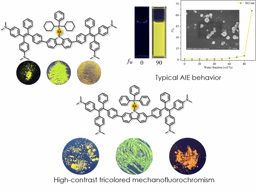 力致变色材料在传感器等前沿领域具有重要的应用价值,高效聚集态发光和机械刺激前后显著的荧光颜色差异是实现其有效应用的两个关键指标。部分含膦配体的金(I)配合物表现出优异的聚集诱导光物理现象,吸引了科学研究人员的极大研究兴趣。然而,兼具聚集诱导发光(AIE)特性和三色机械变色功能的膦配体修饰金(I)配合物仍属空白。通过配体调控策略优化辅助配体类型,有望同步实现AIE效应与三色机械变色性能,这为开发新型智能发光材料提供了理论依据。