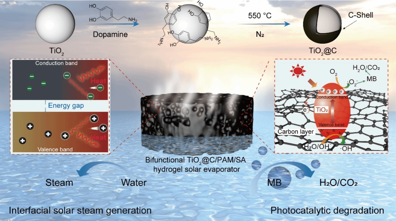 图1 双功能TiO2@C/PAM/SA水凝胶实现同步太阳能蒸汽产生与光催化降解功能。