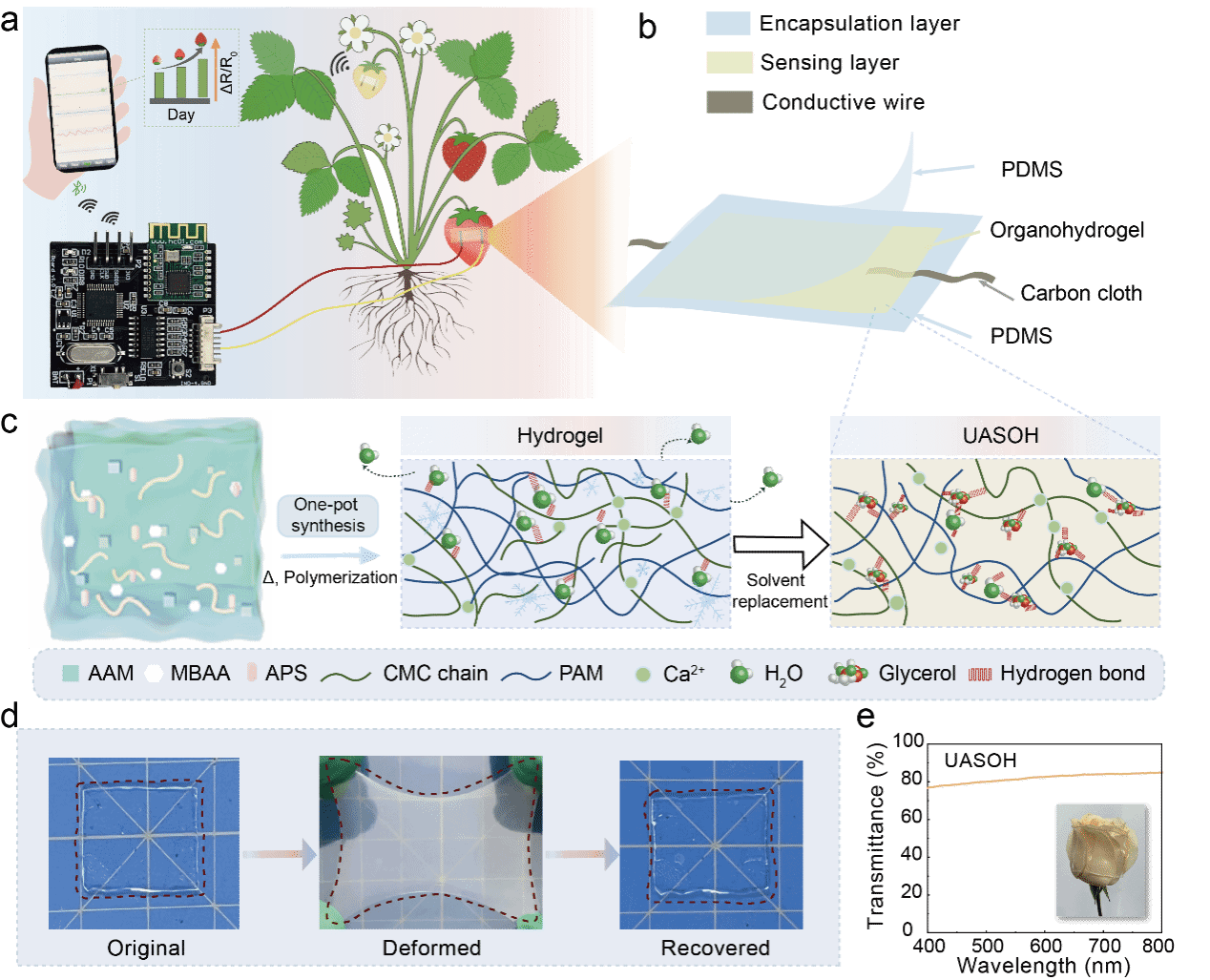 本研究提出了甘油诱导氢键增强策略,开发了一种新型超柔软、抗脱水且高度可拉伸的有机水凝胶应变传感器(UASOH)。该策略通过引入甘油/水二元溶剂体系,增强聚丙烯酰胺(PAM)与羧甲基纤维素(CMC)在二元溶剂体系中的氢键结合能,随后金属钙离子(Ca2+)与羧甲基纤维素(CMC)耦合,同步提升了水凝胶结构稳定性和离子电导率。所制备得UASOH具有低杨氏模量(18 kPa)、出色的拉伸性(1448%)和出色的保水能力(50天后仍保持82%的含水量),可实现无缝接触和对植物组织的长期监测。与以报道的研究结果相比,基于UASOH的应变传感器展现出超宽的拉伸范围(0-900%)和高灵敏度(应变系数6.18)等更为突出的性能。与此同时,我们进一步将制备的传感器与蓝牙模块集成,开发一种无线传感系统,用于在理想和非生物胁迫条件下进行非侵入性原位植物生长监测。这种基于UASOH的高性能应变传感器及其集成的无线传感系统在实际种植物监测应用中显示出巨大的潜力。