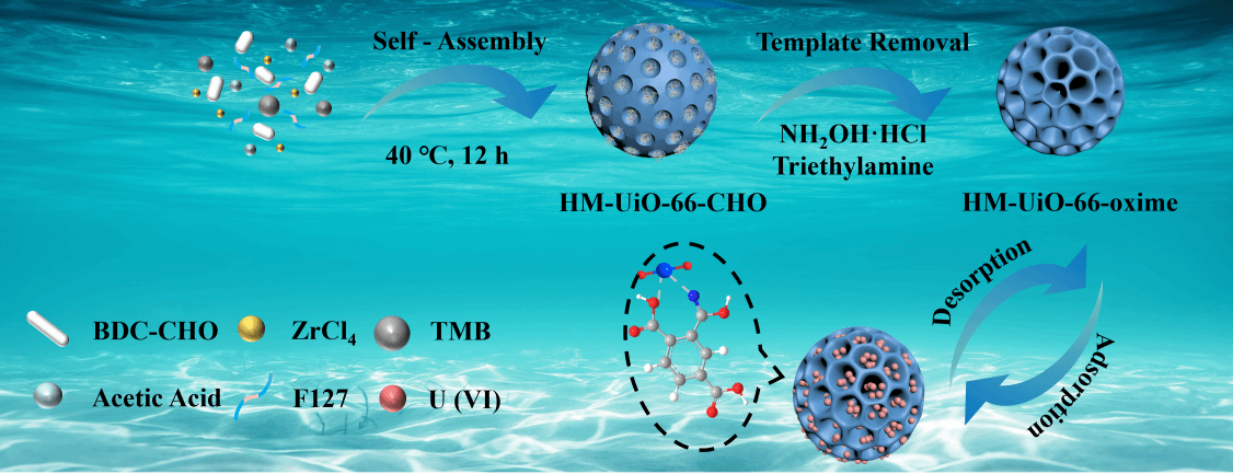 从海水中高效提取铀对于确保核能的可持续发展至关重要。因此,本论文通过软模板策略结合一步后合成改性(PSM)开发了一种创新的分层介孔金属有机框架(HM-UiO-66-oxime),以实现铀的高效吸附。HM-UiO-66-oxime为铀的吸附提供了充足的吸附位点和较大的接触面积,多孔通道结构有利于UO22+快速扩散到吸附剂中,使材料只需20 min 即可达到吸附平衡。引人注目的是,通过一步PSM策略,HM-UiO-66-oxime的铀提取能力在pH=6下可达483.09 mg g−1。此外,在天然海水中浸泡16天后,可实现7.47 mg-U/g-Ads的高铀吸收能力。因此,这项工作不仅推进了多级介孔MOF(HM-MOFs)吸附剂的设计和开发,同时在重金属分离和药物递送等领域也展示出巨大的应用潜力。