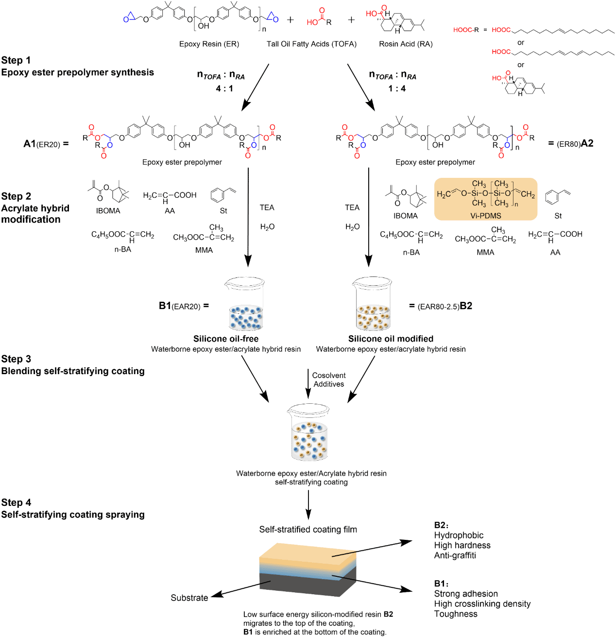 近日,威廉希尔中国化学学部申亮教授、丁永波副教授团队在涂料领域经典国际期刊《Progress in Organic Coatings》上发表了题为“Bio-based self-stratifying waterborne coatings via silicone-induced phase separation for enhanced hardness and anti-graffiti performance”的研究成果。该研究以绿色可持续发展为导向,设计并合成了一种基于松香改性环氧酯/丙烯酸杂化树脂的自分层水性涂料体系。通过引入少量乙烯基硅油,体系在固化过程中可自发发生相分离,形成上层富含硅油的疏水硬质层与下层粘结强韧层,实现了单步制备具有分层结构的功能涂层。