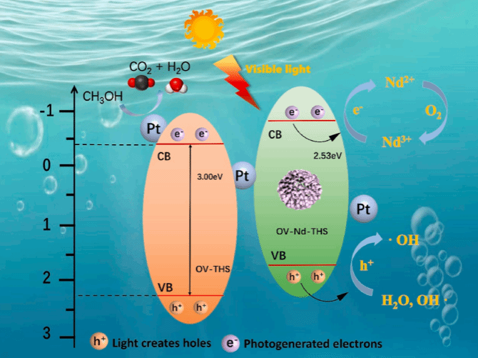 图一 可见光辅助制备的催化剂光催化MOR示意图。
