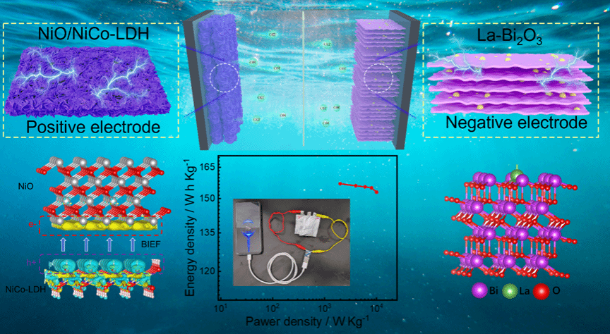 图1:NiO/NiCo-LDH与La-Bi2O3结构示意图及软包不对称超级电容器性能展示