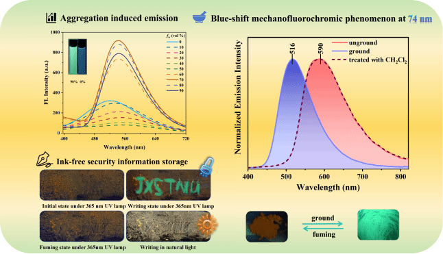 近十年来,力致荧光变色(Mechanofluorochromic,MFC)材料因其优异的光物理性质和广泛的应用前景而成为研究的热点。迄今为止,已报道的力致荧光变色材料大部分都显示出力致红移荧光变色,相比之下,力致蓝移荧光变色材料数量较少,而同时显示出聚集诱导发光(AIE)和高对比度力致蓝移荧光变色性质的化合物是非常少见的。