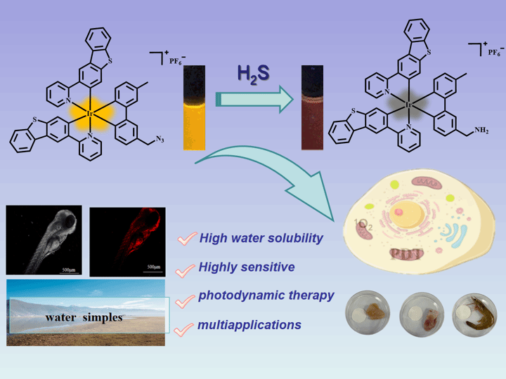 硫化氢(H2S)是一种有毒的无色气体,具有强烈的臭鸡蛋味,广泛存在于各种环境中。其污染背景涉及自然源和人为源,对环境和健康构成威胁。荧光检测技术在硫化氢(H2S)检测领域越来越受到青睐。因此开发一种高灵敏度检测硫化氢(H2S)荧光探针用于环境保护,食品安全至关重要。本文通过使用叠氮基团作为识别位点,合成了基于Ir(Ш)配合物的荧光探针Ir-N3,用于检测硫化氢。实验结果显示,加入硫化氢后,Ir-N3的荧光显著减弱,而其他竞争物质则没有引起任何变化。研究结果表明,Ir-N3探针具有显著的硫化氢检测能力,其检测限低(LOD = 0.518 μM)、斯托克斯位移大(235 nm)、响应速度快、对活细胞的细胞毒性低以及良好的水溶性。因此,该探针被进一步应用于实际水样、啤酒、腐烂食物、斑马鱼和HeLa细胞中的硫化氢检测。此外,荧光探针Ir-N3被光激发后能在溶液中和细胞内有效生成单线态氧和活性氧(ROS),从而导致细胞死亡。