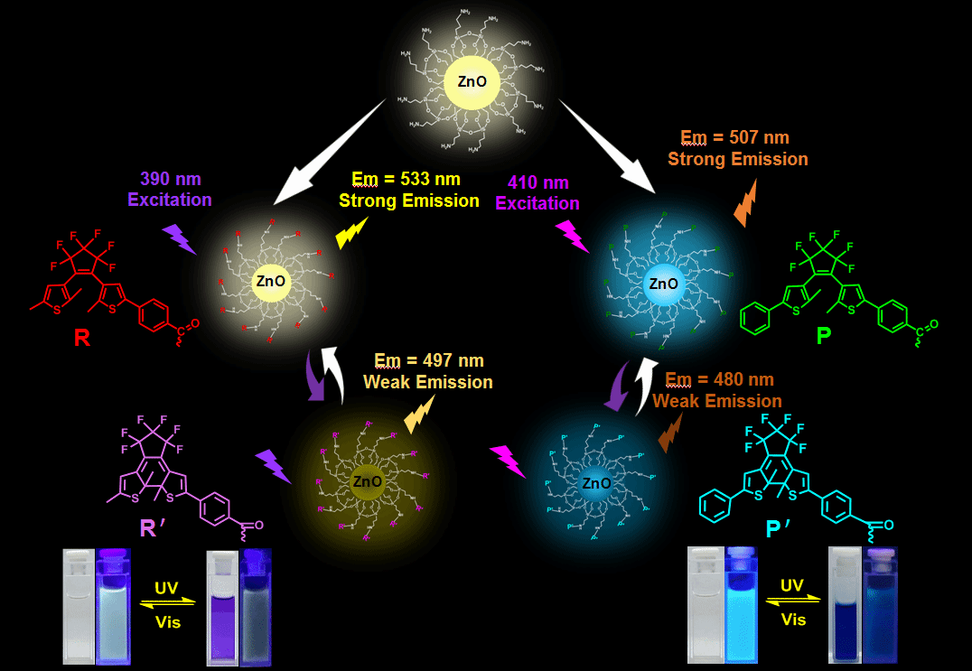研究团队将硅包覆氧化锌量子点(Si@ZnO QDs)与光致变色分子二芳基乙烯结合,利用紫外-可见光调控二芳基乙烯的“开环-闭环”异构化,实现了量子点荧光的“开-关”切换。这两种荧光开关具有良好的生物相容性,可成功地用于生物成像。并且这两种荧光开关还可以制成荧光油墨用于信息加密,为量子点荧光开关的构建提供了新的策略,二芳基乙烯及其在生物成像、加密、防伪等方面的应用。