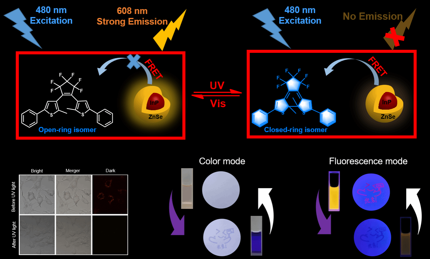 研究团队将InP@ZnSe QDs与光致变色分子二芳基乙烯结合,通过紫外-可见光调控,实现了荧光与颜色信号的同步切换,且液体荧光开关和固体荧光开关的FME分别为96.2%和89.6%,并成功应用于生物成像和防伪领域,为新型高效颜色/荧光双开关材料的设计和构建提供了一种可供选择的途径。