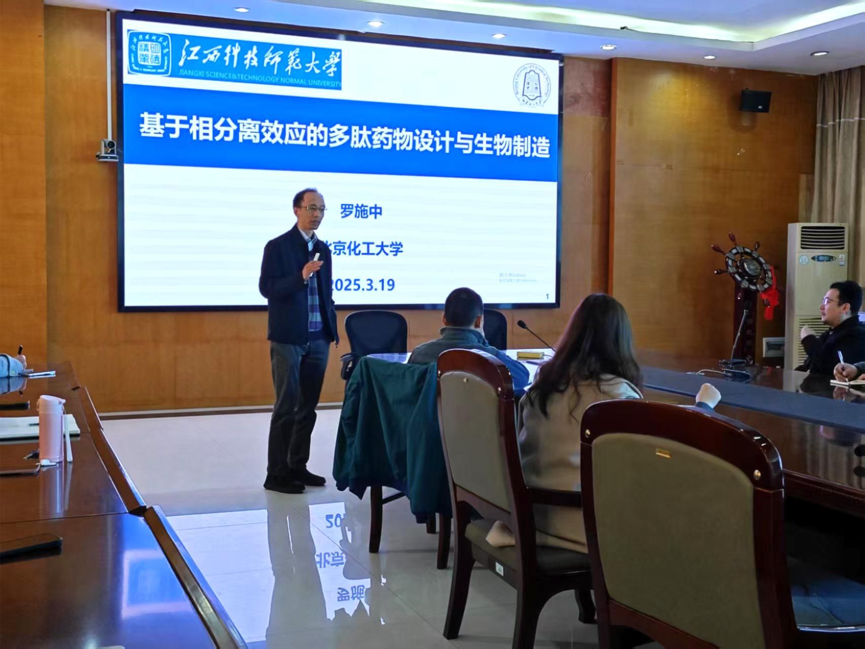 3月19日,北京化工大学生命科学与技术学院罗施中教授来校作题为“基于相分离效应的多肽药物设计与生物制造”的学术报告。